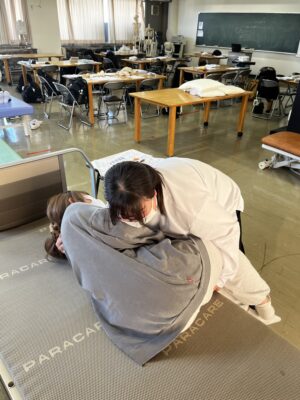 授業では、学生たちが実際にペアを組み、「介助する側」と「介助される側(患者役)」の両方を体験します。